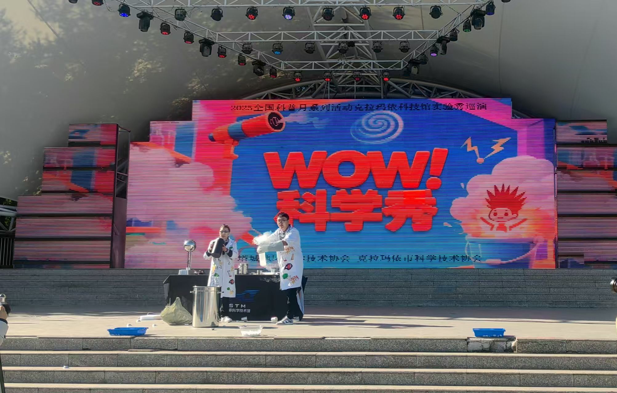 啟動(dòng)儀式上,克拉瑪依科技館自創(chuàng)的《Wow科學(xué)秀》成為現(xiàn)場(chǎng)焦點(diǎn),格外吸睛。科技館輔導(dǎo)員精心設(shè)計(jì)了干冰仙境、空氣炮、怒發(fā)沖冠、萊頓瓶、液氮爆炸等五大精彩實(shí)驗(yàn),以“趣味演示+互動(dòng)體驗(yàn)”的形式,將抽象的科學(xué)原理轉(zhuǎn)化為直觀的實(shí)驗(yàn)畫面,生動(dòng)展現(xiàn)科學(xué)知識(shí)和科技魅力。妙趣橫生的科普實(shí)驗(yàn)吸引了眾多觀眾凝神觀看,現(xiàn)場(chǎng)高潮迭起,觀眾們掌聲與驚嘆聲接連不斷。