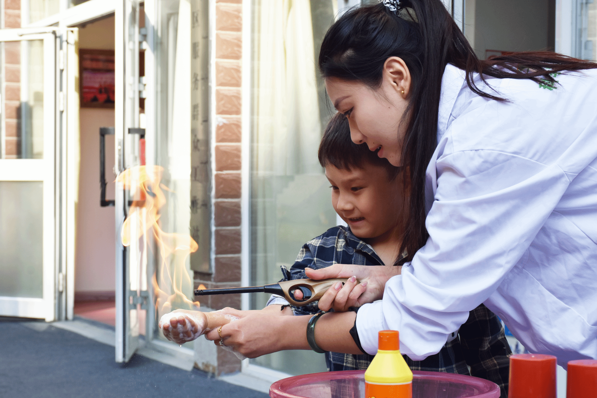 整個活動的高潮莫過于“掌中火”實驗。志愿者將丁烷氣體注入充滿洗手液的水中,撈起一堆泡沫,然后輕輕點燃——霎時間,火焰在掌心騰起,卻又迅速熄滅。孩子們先是倒吸一口涼氣,隨后爆發出熱烈掌聲。老師借此告訴大家,其實是肥皂水保護了皮膚,而火焰只是短暫燃燒了丁烷氣體。